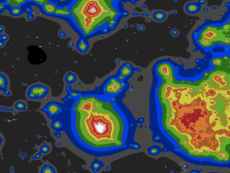 The central cross marks the location of the Alamogordo clear sky chart. Tiny crosses mark other charts. This map assumes an observer at sea level. A real observer should see a slightly darker sky.
