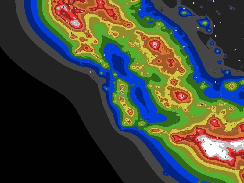 The central cross marks the location of the Atascadero clear sky chart. Tiny crosses mark other charts. This map assumes an observer at sea level. A real observer should see a slightly darker sky.