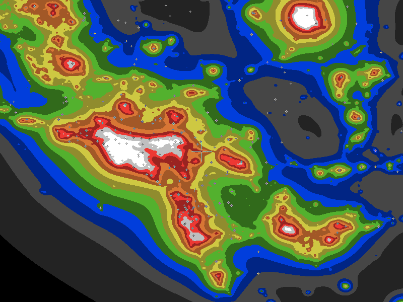 The central cross marks the location of the Banning clear sky chart. Tiny crosses mark other charts. This map assumes an observer at sea level. A real observer should see a slightly darker sky.