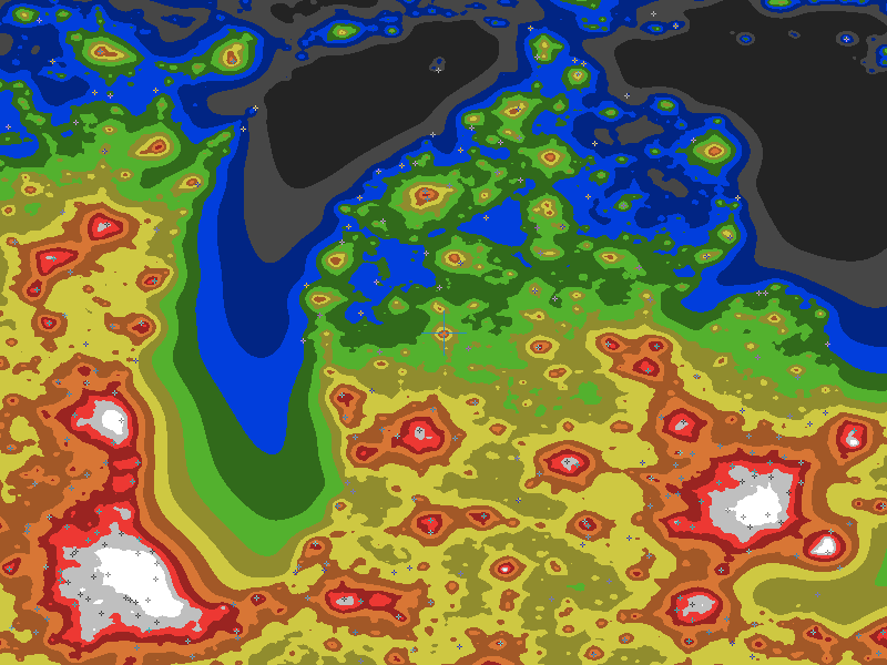 The central cross marks the location of the Big Rapids clear sky chart. Tiny crosses mark other charts. This map assumes an observer at sea level. A real observer should see a slightly darker sky.