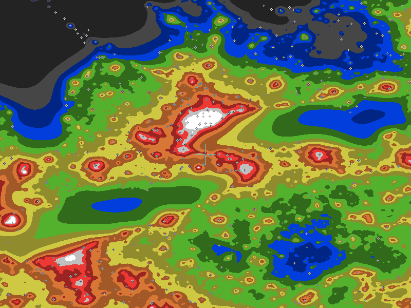 The central cross marks the location of the Beamsville clear sky chart. Tiny crosses mark other charts. This map assumes an observer at sea level. A real observer should see a slightly darker sky.