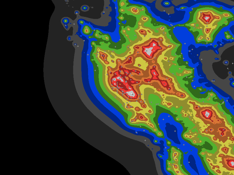 The central cross marks the location of the CSM Observatory clear sky chart. Tiny crosses mark other charts. This map assumes an observer at sea level. A real observer should see a slightly darker sky.