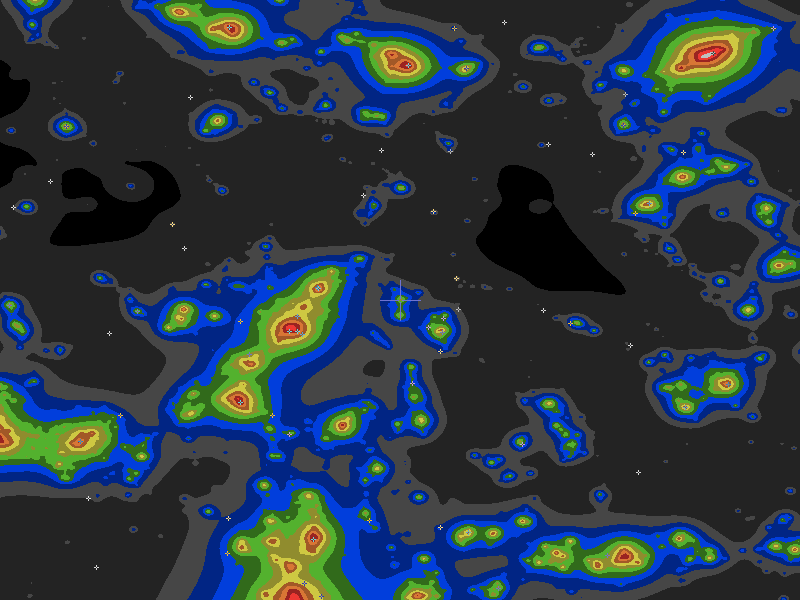 The central cross marks the location of the Driggs clear sky chart. Tiny crosses mark other charts. This map assumes an observer at sea level. A real observer should see a slightly darker sky. So it underestimates the sky darkness at Driggs because of its 6112ft elevation.