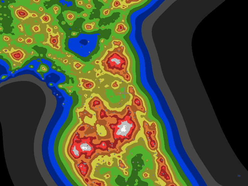 The central cross marks the location of the Edward D Finan Observatory clear sky chart. Tiny crosses mark other charts. This map assumes an observer at sea level. A real observer should see a slightly darker sky.
