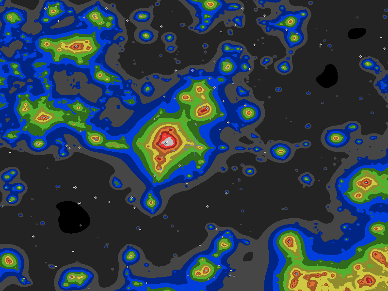 The central cross marks the location of the Edgewood Skies Observatory clear sky chart. Tiny crosses mark other charts. This map assumes an observer at sea level. A real observer should see a slightly darker sky. So it underestimates the sky darkness at Edgewood Skies Observatory because of its 6555ft elevation.