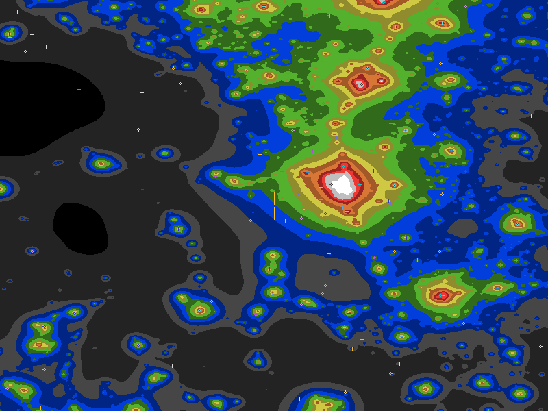The central cross marks the location of the Elbow Falls clear sky chart. Tiny crosses mark other charts. This map assumes an observer at sea level. A real observer should see a slightly darker sky. So it underestimates the sky darkness at Elbow Falls because of its 1615m elevation.