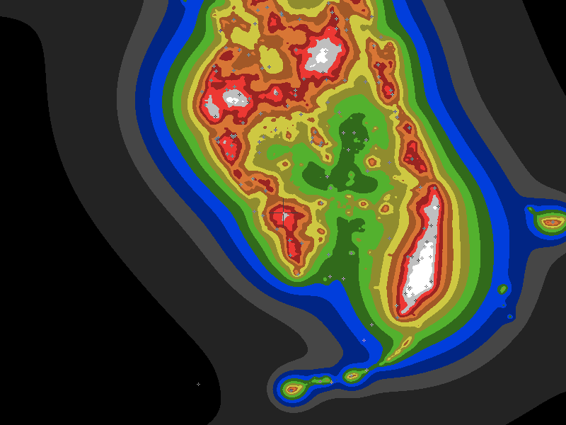 The central cross marks the location of the Fort Myers clear sky chart. Tiny crosses mark other charts. This map assumes an observer at sea level. A real observer should see a slightly darker sky.