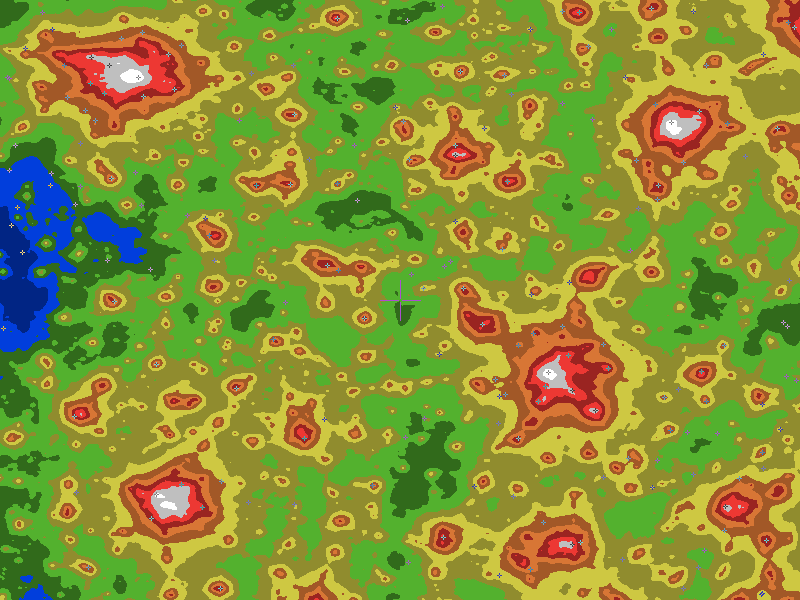 The central cross marks the location of the Golden Pond Observatory clear sky chart. Tiny crosses mark other charts. This map assumes an observer at sea level. A real observer should see a slightly darker sky.