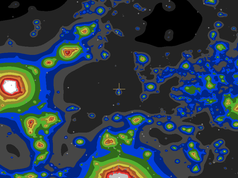 The central cross marks the location of the Grand Canyon Star Party (South Rim) clear sky chart. Tiny crosses mark other charts. This map assumes an observer at sea level. A real observer should see a slightly darker sky. So it underestimates the sky darkness at Grand Canyon Star Party (South Rim) because of its 7001ft elevation.
