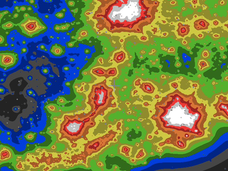 The central cross marks the location of the Granger Lake clear sky chart. Tiny crosses mark other charts. This map assumes an observer at sea level. A real observer should see a slightly darker sky.
