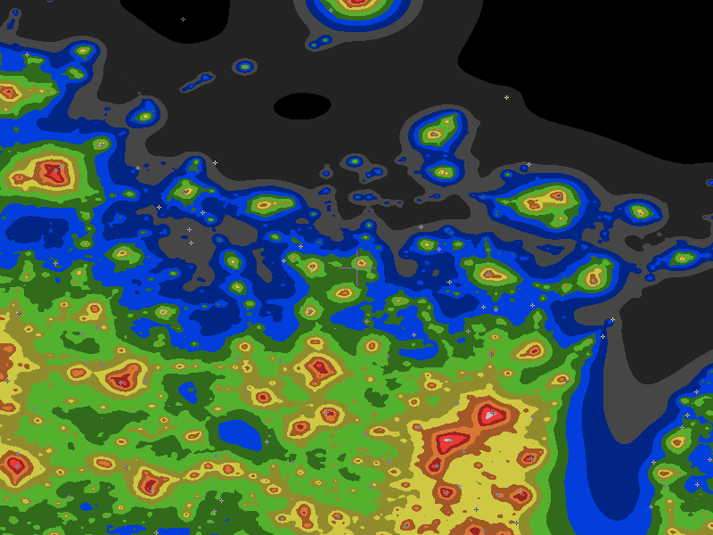 The central cross marks the location of the Inukshuk Observatory clear sky chart. Tiny crosses mark other charts. This map assumes an observer at sea level. A real observer should see a slightly darker sky.