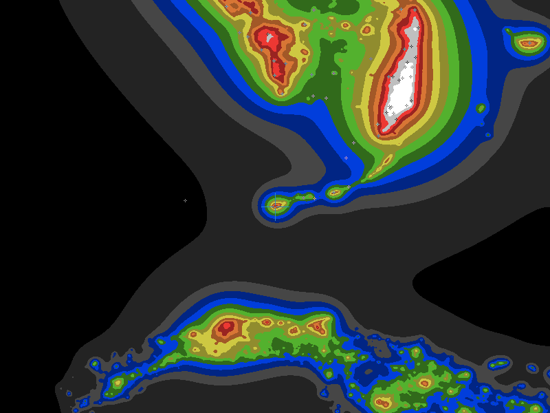 The central cross marks the location of the Key West clear sky chart. Tiny crosses mark other charts. This map assumes an observer at sea level. A real observer should see a slightly darker sky.