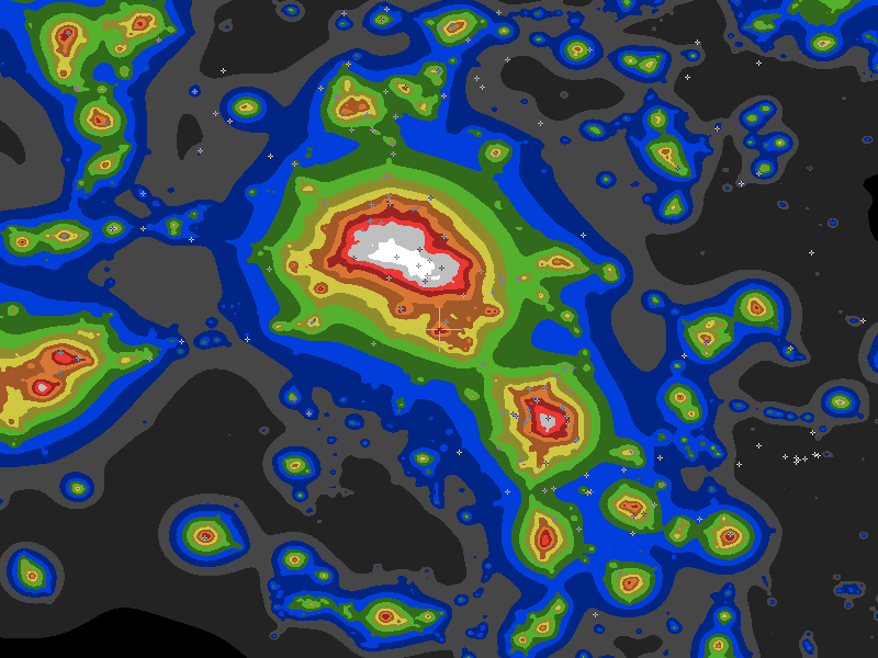 The central cross marks the location of the Lenomiya Observatory clear sky chart. Tiny crosses mark other charts. This map assumes an observer at sea level. A real observer should see a slightly darker sky.