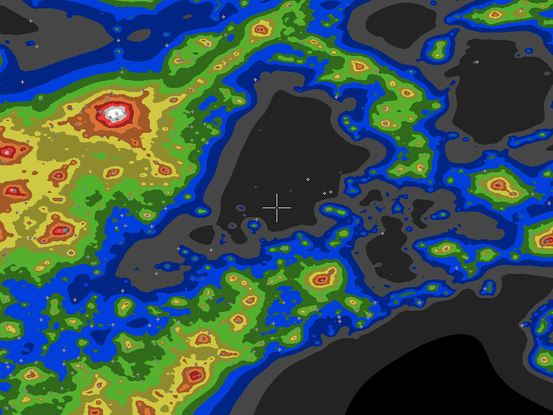 The central cross marks the location of the Medawisla Lodge clear sky chart. Tiny crosses mark other charts. This map assumes an observer at sea level. A real observer should see a slightly darker sky.