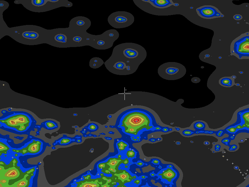 The central cross marks the location of the Montreal River Harbour clear sky chart. Tiny crosses mark other charts. This map assumes an observer at sea level. A real observer should see a slightly darker sky.