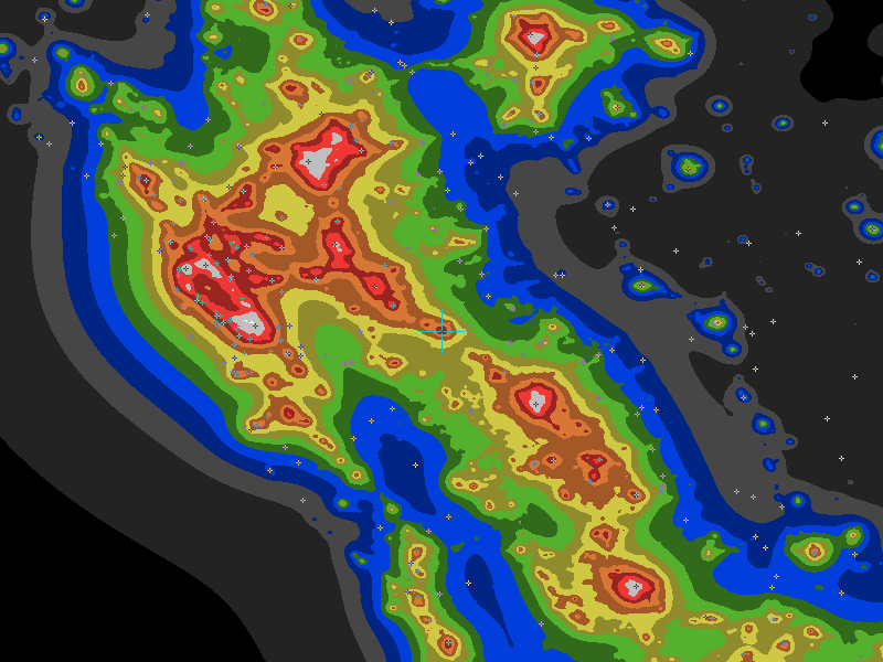 The central cross marks the location of the Merced clear sky chart. Tiny crosses mark other charts. This map assumes an observer at sea level. A real observer should see a slightly darker sky.
