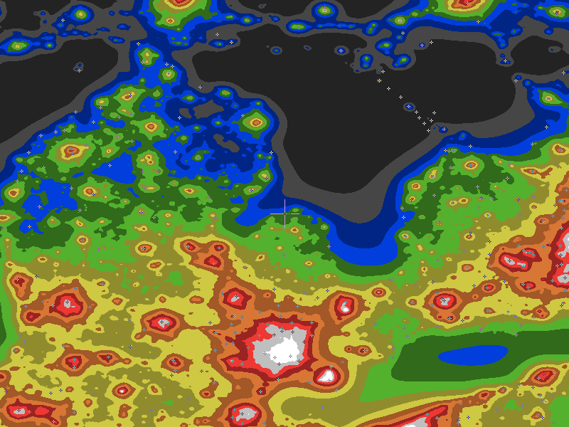 The central cross marks the location of the Oak Beach Observatory clear sky chart. Tiny crosses mark other charts. This map assumes an observer at sea level. A real observer should see a slightly darker sky.