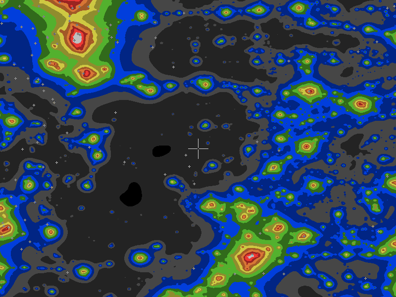 The central cross marks the location of the Picture Canyon clear sky chart. Tiny crosses mark other charts. This map assumes an observer at sea level. A real observer should see a slightly darker sky.