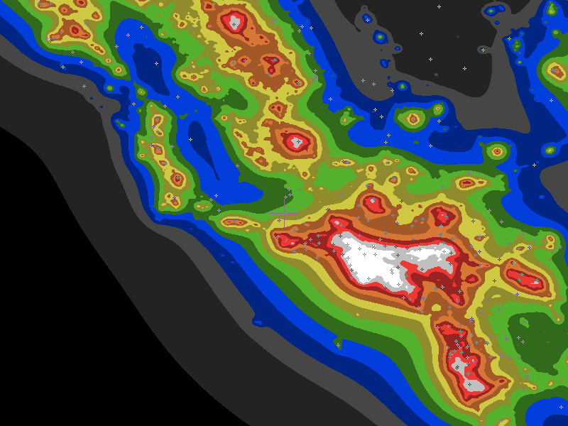 The central cross marks the location of the Rose Valley Campground clear sky chart. Tiny crosses mark other charts. This map assumes an observer at sea level. A real observer should see a slightly darker sky.