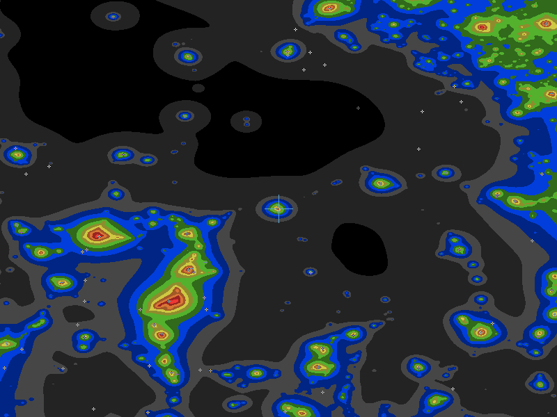 The central cross marks the location of the Revelstoke clear sky chart. Tiny crosses mark other charts. This map assumes an observer at sea level. A real observer should see a slightly darker sky.