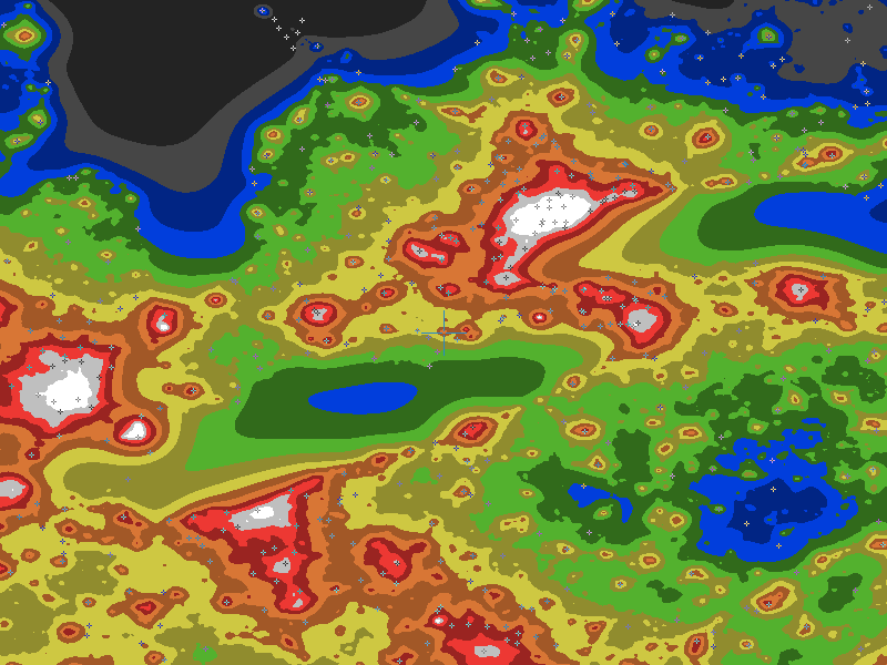 The central cross marks the location of the Simcoe clear sky chart. Tiny crosses mark other charts. This map assumes an observer at sea level. A real observer should see a slightly darker sky.