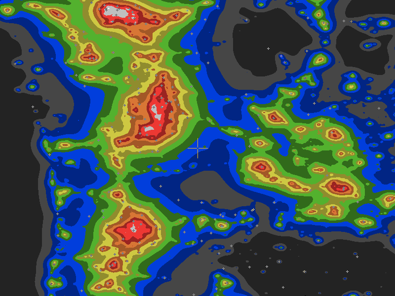 The central cross marks the location of the Sunrise Point clear sky chart. Tiny crosses mark other charts. This map assumes an observer at sea level. A real observer should see a slightly darker sky. So it underestimates the sky darkness at Sunrise Point because of its 6049ft elevation.