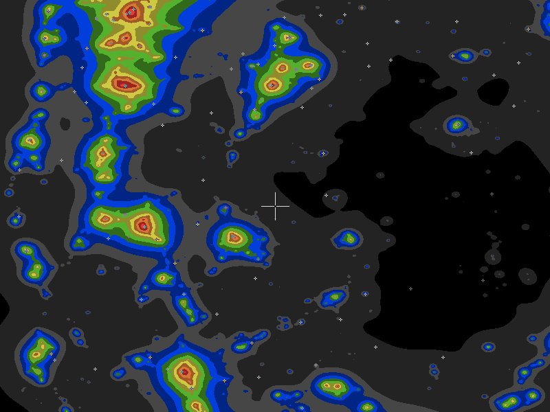 The central cross marks the location of the Spodue Lookout clear sky chart. Tiny crosses mark other charts. This map assumes an observer at sea level. A real observer should see a slightly darker sky. So it underestimates the sky darkness at Spodue Lookout because of its 6459ft elevation.