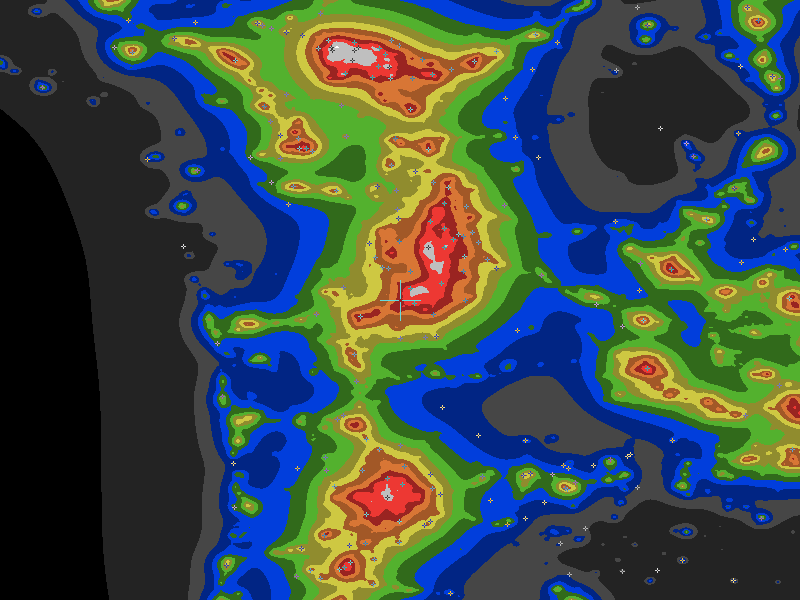 The central cross marks the location of the Steilacoom clear sky chart. Tiny crosses mark other charts. This map assumes an observer at sea level. A real observer should see a slightly darker sky.