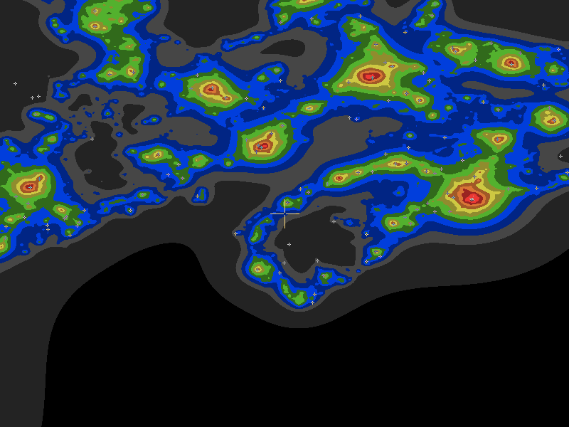 The central cross marks the location of the South Range clear sky chart. Tiny crosses mark other charts. This map assumes an observer at sea level. A real observer should see a slightly darker sky.