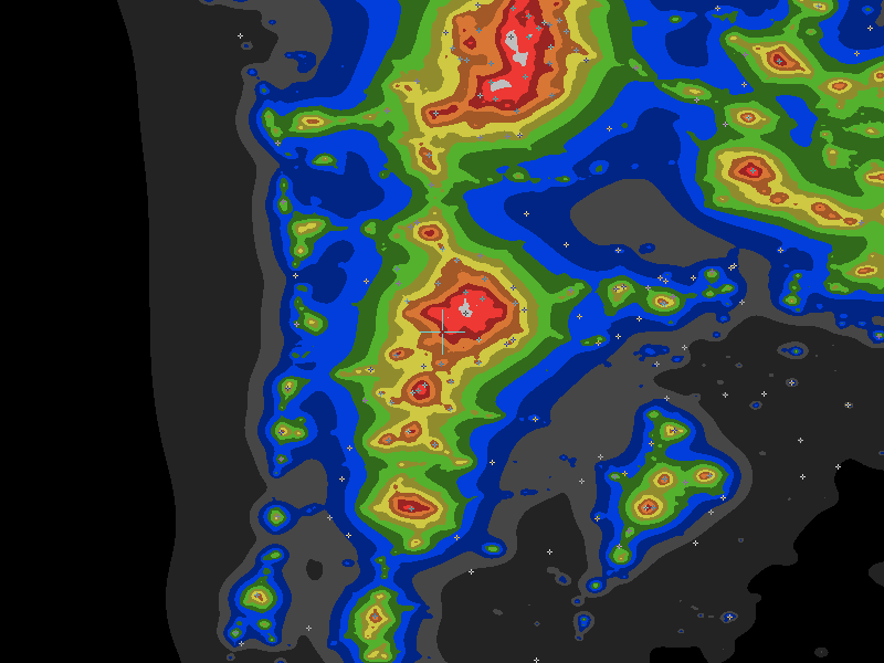 The central cross marks the location of the Tualatin River National Wildlife Refuge clear sky chart. Tiny crosses mark other charts. This map assumes an observer at sea level. A real observer should see a slightly darker sky.