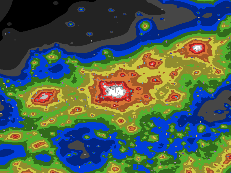 The central cross marks the location of the Terrebonne clear sky chart. Tiny crosses mark other charts. This map assumes an observer at sea level. A real observer should see a slightly darker sky.