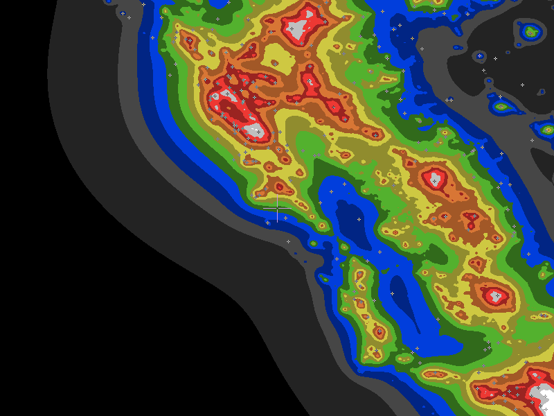 The central cross marks the location of the Tularcitos Observatory clear sky chart. Tiny crosses mark other charts. This map assumes an observer at sea level. A real observer should see a slightly darker sky.