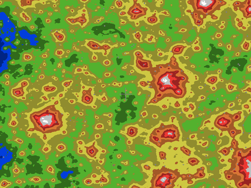 The central cross marks the location of the Twin Pines Observatory clear sky chart. Tiny crosses mark other charts. This map assumes an observer at sea level. A real observer should see a slightly darker sky.