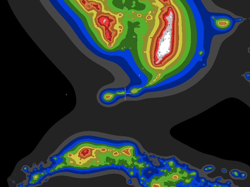 The central cross marks the location of the Winter Star Party clear sky chart. Tiny crosses mark other charts. This map assumes an observer at sea level. A real observer should see a slightly darker sky.